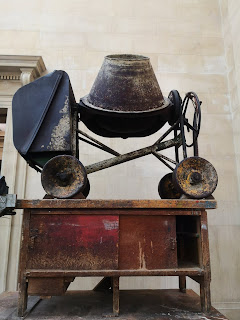 For the shame! The reasoning behind this display of anvils, cement mixers, weighing machines, pallet trucks, gates, and chains goes something like this. The Duveen Galleries were originally designed to be the first purpose built sculpture galleries in all England, intended to rival the ancient sculpture courts at the V&A, and, as if in response to the V&A's collection of Tuscan plaster casts, models of martyr's tombs, and replicas of Roman columns, Nelson (and there's a name that suggests knowledge of columns and sculpture) is displaying monuments from another, more recent, bygone age.